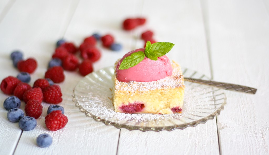En mi opinión, el chocolate oscuro no combina con los frutos del bosque. ¡Hay demasiada competición de sabores! El chocolate blanco, al ser más suave, combina a la perfección con la acidez de las frambuesas. En este «blondie» están integradas las frambuesas junto con almendras para disfrutar de una versión más fresca del tradicional brownie. Y con un poco de sorbete de frambuesa tienes un postre o merienda ideal para las tardes de verano.