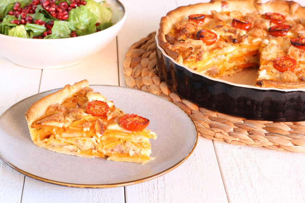 Me fui a vivir en una residencia de estudiantes en Silkeborg a los 18 años y allí fue donde empecé a cocinar para mí sola. No tenía pereza y me encantaba comprar montones de verduras en el mercado de los sábados para tener para toda la semana. Lo más fácil era hacer wok, pero las tartas saladas también se convirtieron en uno de mis platos favoritos porque era una buena manera de aprovechar la verdura. Mis amigas de la residencia también preparaban deliciosas tartas saladas y frecuentemente nos reuníamos para cenar juntas. No teníamos tanta experiencia en la cocina como para innovar con sabores, pero la técnica la dominábamos bastante bien a pesar de que usábamos hornos de mesa en los que apenas cabían las tartas. Con el tiempo he probado combinaciones de rellenos diferentes y esta es una de mis favoritas.
