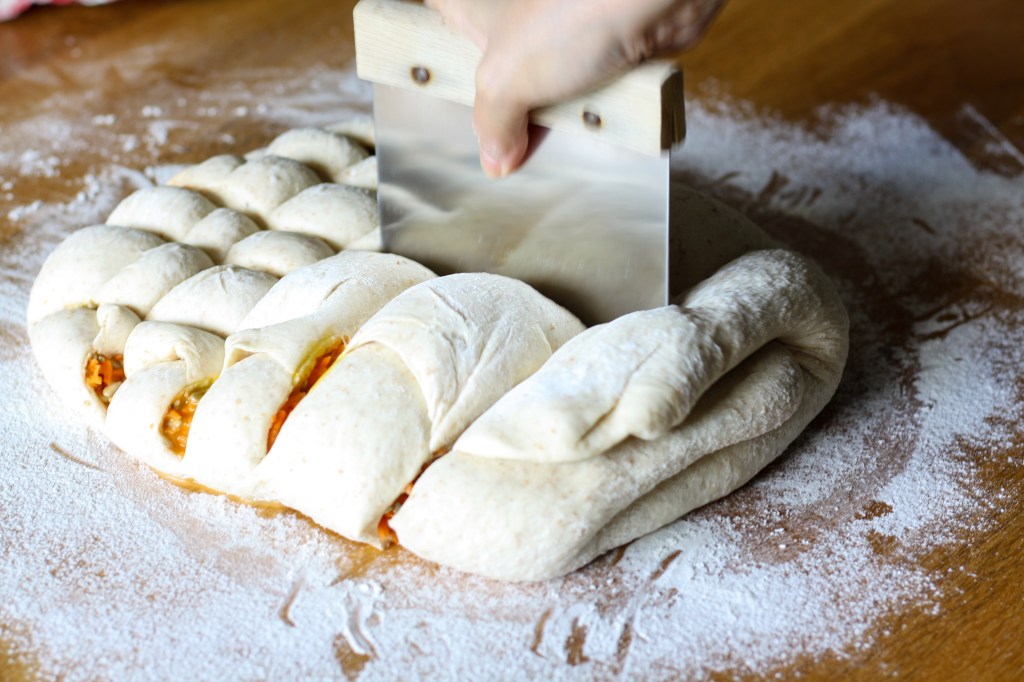 Con la ayuda de una espátula de panadero o un cuchillo grande vamos a empezar a cortar la masa en trocitos: