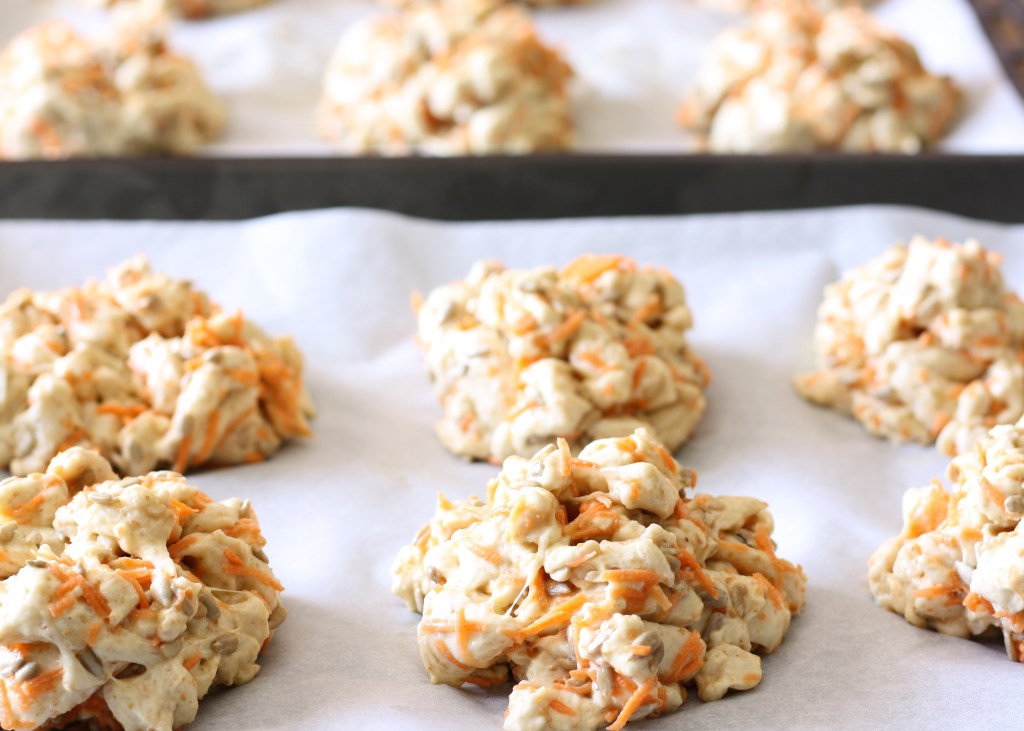 Cubrimos tres bandejas con papel de hornear y vamos formando 16 montoncitos de la mezcla de masa: Yo pongo 6 montoncitos en dos bandejas y cuatro montoncitos un poco más grandes en una, para tener distintos tamaños.