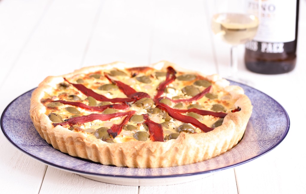Cuando hace poco, mi marido llegó a casa con una lata gigante de aceitunas andaluzas que le había regalado nuestro amigo Javi, al abrirlas me vi paseando por las calles de Ronda, cruzando el Puente Viejo para seguir caminando por el casco antiguo hasta ver la Iglesia del Espíritu Santo y después bajar hasta la gran puerta de la muralla para finalmente mezclarme entre la gente en el mercado del Zoco. Estas aceitunas son únicas, casi diría que adictivas. Y aunque me daba un poco de miedo usarlas para cocinar, porque sería un desperdicio insufrible si no hubiera salido bien, creo que he acertado haciendo esta tarta. Es un homenaje a la banderilla, pero como aquí no consigo vermú de España, me la he tomado acompañado de un fino, que tampoco está nada mal. Elegí hacer la tarta con queso feta, pero creo que un manchego o similar también le quedaría muy bien. ¡Pruébalo y me cuentas! Para un aperitivo o un entrante, para cualquier época del año funciona, porque la puedes servir fría o tibia. Espero que te guste.